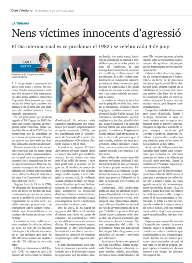 JUN 2022 El Dia internacional es va proclamar el 1982 i se celebra cada 4 de junyActualitzada 03/06/2022 a les 06:25 Carla Riestra A fi de protegir i preservar els drets dels nens i nenes, les Nacions Unides commemoren cada…