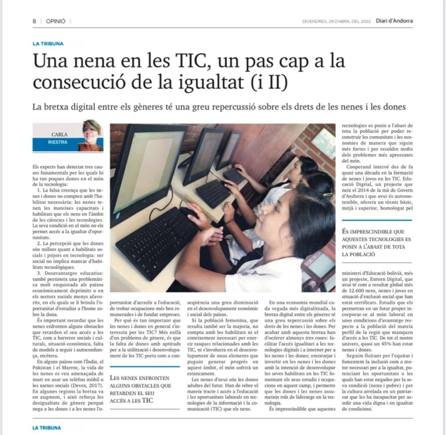 Cooperand intervé des de fa quasi una dècada en la formació de nenes i joves en les TIC. Educació Digital, un projecte que neix el 2014 de la mà de Govern d’Andorra i que avui és autosostenible, ofereix un tècnic bàsic, mitjà i superior, homologat pel ministeri d’Educació bolivià, més un projecte, Entorn Digital, que avui té com a resultat global més de 12.600 nens, nenes i joves en situació d’exclusió social que han estat certificats. Estudis que els permetran en un futur proper incorporar-se al món laboral en unes condicions d’avantatge respecte a la població del mateix perfil de la regió que manquen d’accés a les TIC. De tot el nostre univers, quasi un 45% han estat nenes i dones.