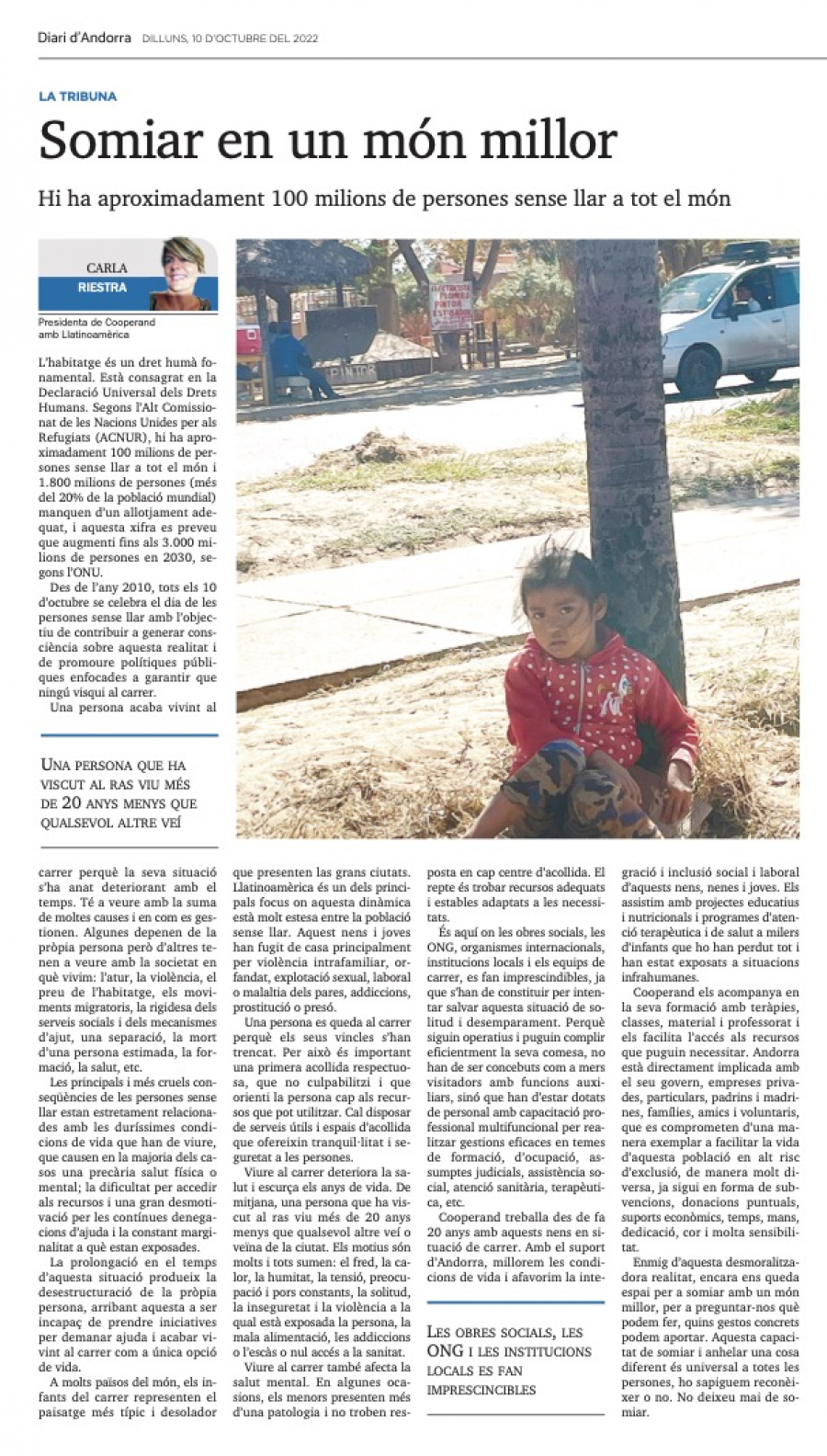 Cooperand treballa des de fa 20 anys amb aquests nens en situació de carrer. Amb el suport d’Andorra, millorem les condicions de vida i afavorim la integració i inclusió social i laboral d’aquests nens, nenes i joves. Els assistim amb projectes educatius i nutricionals i programes d’atenció terapèutica i de salut a milers d’infants que ho han perdut tot i han estat exposats a situacions infrahumanes.